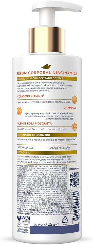 O novo Dove Sérum Hidratante Corporal Niacinamida, com efeito uniformizador, atua além da hidratação, ajudando a uniformizar o tom da pele e restaurar sua luminosidade natural. Este hidratante corporal oferece 48h de hidratação regenerativa com ativos de alta potência, como Colágeno Vegano*, que promove firmeza, sustentação e resistência à pele; Vitamina C, que auxilia na proteção contra radicais livres, amenizando a aparência de marcas escurecidas e ajudando a uniformizar o tom da pele; e Óleo de Rosa Mosqueta, um óleo 100% natural que também contribui para a uniformização da pele. Desenvolvido em parceria com dermatologistas e testado em mulheres reais, o Dove Sérum Hidratante Niacinamida possui uma tecnologia exclusiva e avançada que hidrata profundamente e atua em sinergia com sua pele, ajudando a restaurar seu tom natural e luminosidade de dentro para fora. Está clinicamente comprovado que o Sérum Hidratante Dove Niacinamida uniformiza o tom da pele e reduz a aparência de marcas escurecidas**. Sua fórmula leve e de fácil aplicação é indicada para peles com marcas escurecidas e ressecadas. Use diariamente em todo o corpo como alternativa ao seu creme corporal tradicional para manter a pele hidratada, perfumada e ajudar a promover o equilíbrio do microbioma da pele. Globalmente, Dove não testa seus produtos em animais. A linha de Séruns Deo Hidratantes Dove combina ativos de alta potência para oferecer o cuidado que sua pele necessita. Escolha o Dove Sérum Hidratante Corporal Niacinamida que melhor atende às necessidades da sua pele. Dove. Cuide-se. Proteja-se. Pela beleza sem padrões! *Colágeno de origem vegetal **Resultados baseados em Teste Clínico. Marcas escurecidas causadas pelo sol.